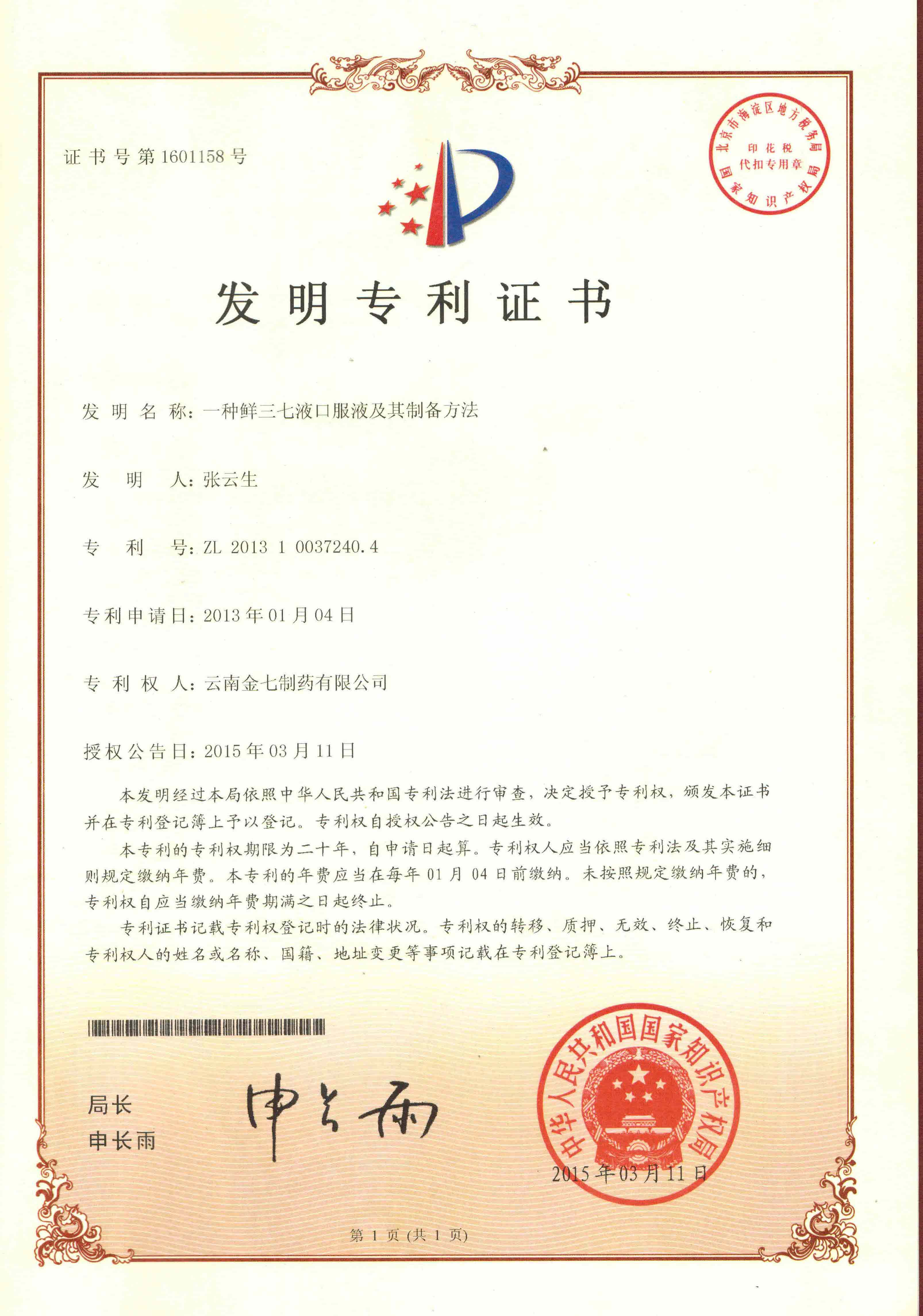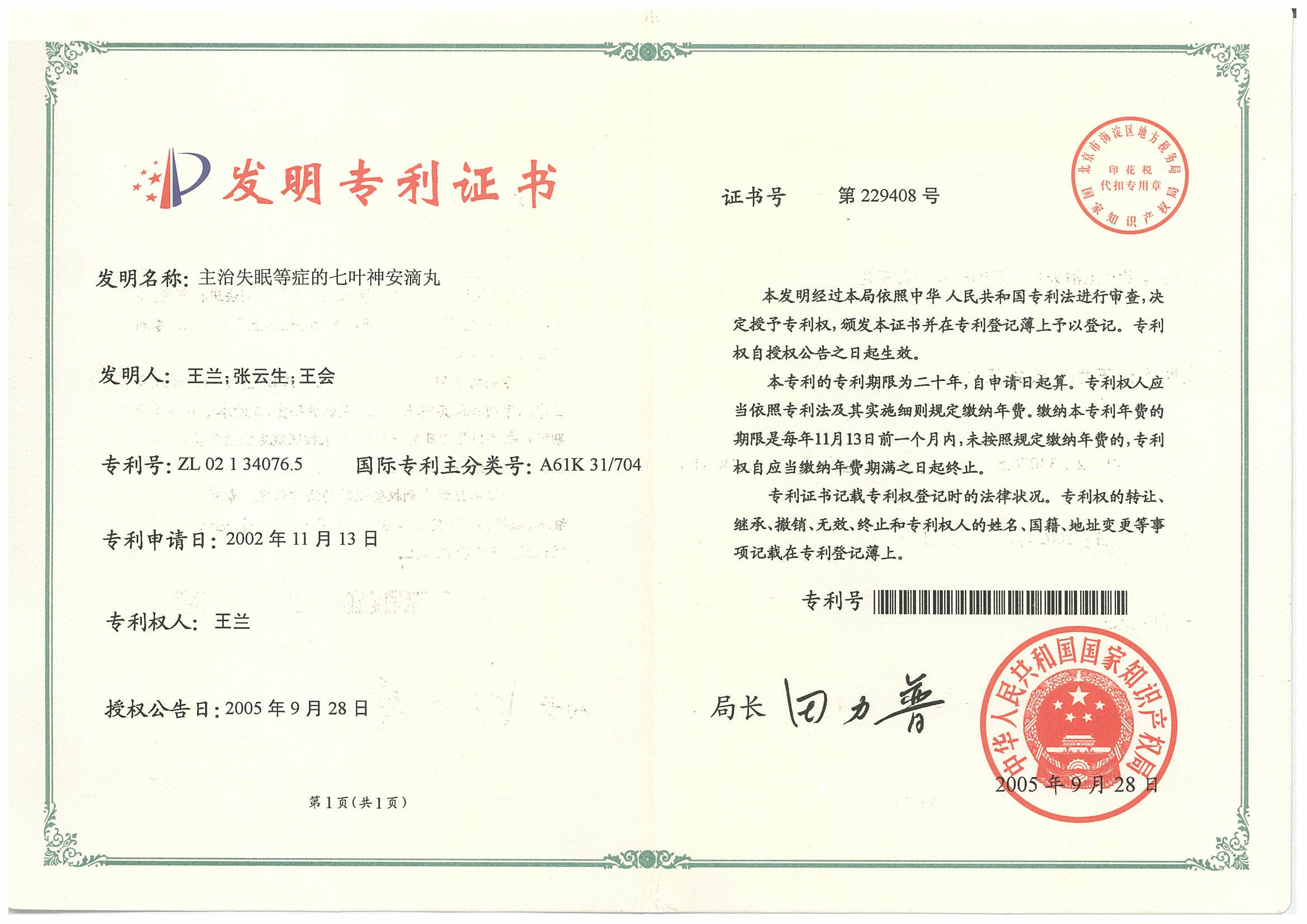 藥品生產批準文號8個,保健食品批準文號2個,其中藥品七葉神安滴丸、保健食品三七口服液為全國獨家專利品種。